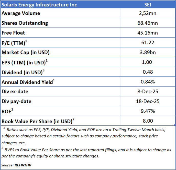 Solaris Energy Infrastructure Inc (NYSE: SEI) provides modular and scalable equipment-based solutions that enable distributed power generation and support the movement and management of raw materials used in oil and natural gas well completion activities. The company conducts its operations through two core business segments: Solaris Power Solutions and Solaris Logistics Solutions.
