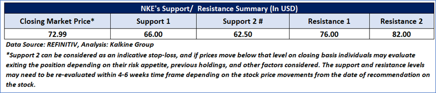 As per our previous US Diversified Opportunities Report published on ‘NKE’ on 20th March 2025, Kalkine provided a ‘Buy’ stance on the stock at USD 72.99, based on “recent business and financial updates, attractive valuation, mention key risk, higher probability metrics, optimistic outlook, and current trading levels”.