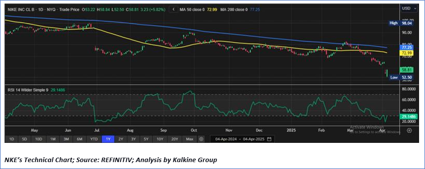 Considering the current trading levels, volatile macro environment, tariffs increased both by US and China, breaking of key important support of USD 60.00, and risks associated, a ‘Sell’ rating is assigned to the “NKE” at the current market price of USD 58.81, as of April 04, 2025, at 07:40 am PDT.