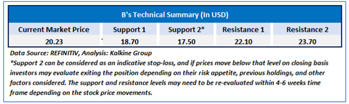 Considering the current trading levels, risks associated, and volatile market conditions on the back of higher interest rates, a ‘Sell’ rating is assigned to the ’B’ at the current market price of USD 22.84 as of Aug 6, 2025 (8.10 am PDT).