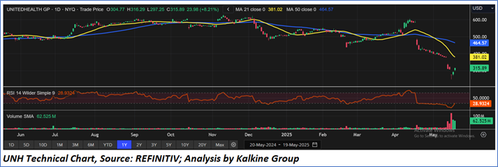 UnitedHealth Group (UNH) has experienced a sharp sell-off, dropping from above USD 480 to a low near USD 297 before rebounding to around USD 316. The stock remains in a strong downtrend, trading well below its 21-day and 50-day moving averages, with the RSI at 28.9 indicating oversold conditions. A recent spike in volume suggests possible capitulation and short-term bargain buying. While a short-term bounce may continue, significant resistance lies near USD 370, and the overall trend remains bearish unless key moving averages are reclaimed.