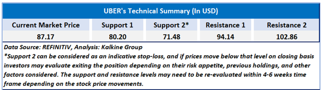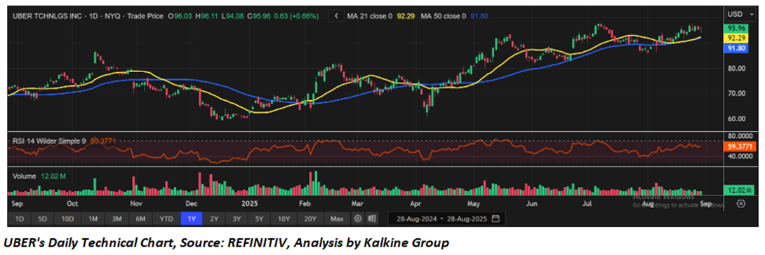 Considering the current trading levels, risks associated, and volatile market conditions, notional gains and price action stance, a "Sell" recommendation on ‘UBER’ has been given at the closing market price of USD 95.96 as on 28 August 2025.