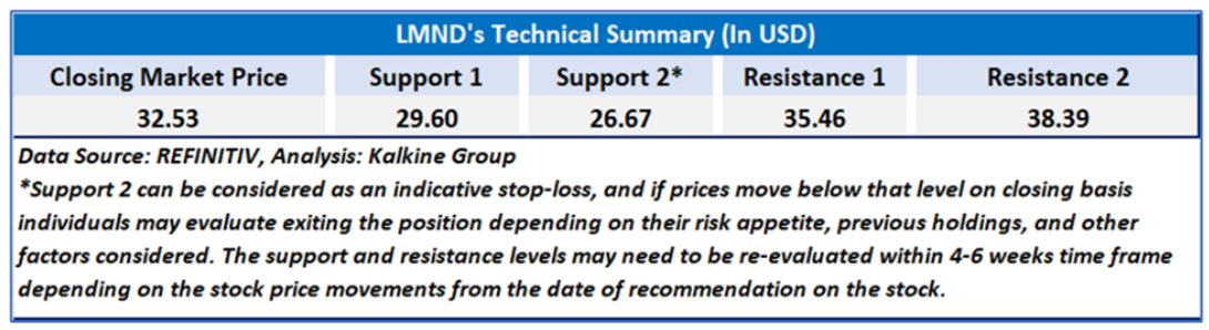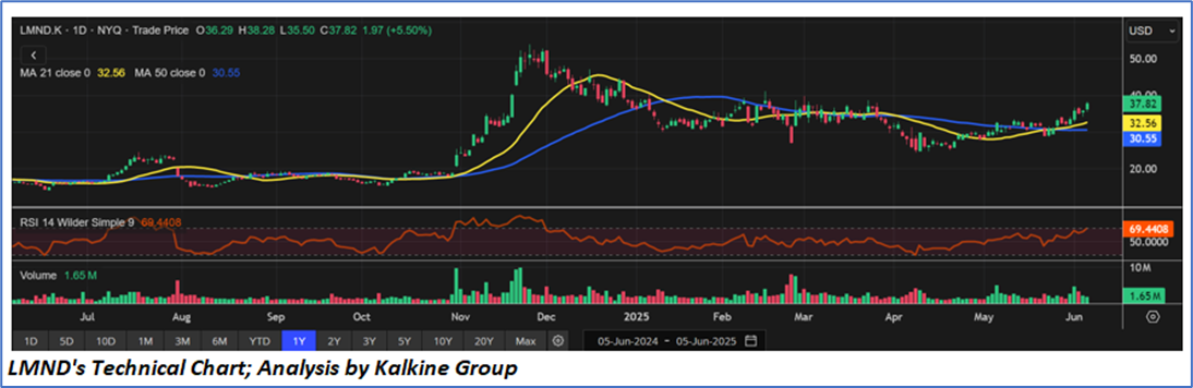As per our previous Kalkine’s Diversified Opportunities Report published on ‘LMND’ on 29th May 2025, Kalkine provided an ‘Buy’ stance on the stock at USD 32.53 based on “potential valuation upside, trading levels, company's accelerated growth with sequential IFP gains, driven by proprietary AI-powered precision pricing, strong telematics adoption, a doubling of cross-sells, and expanded market coverage to over 40% of the U.S. car market” and the stock price has now moved by ~ 16.26% since then and is trading above resistance 1.