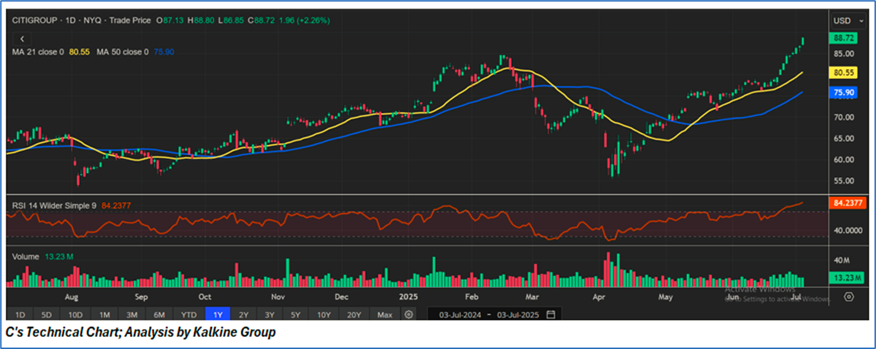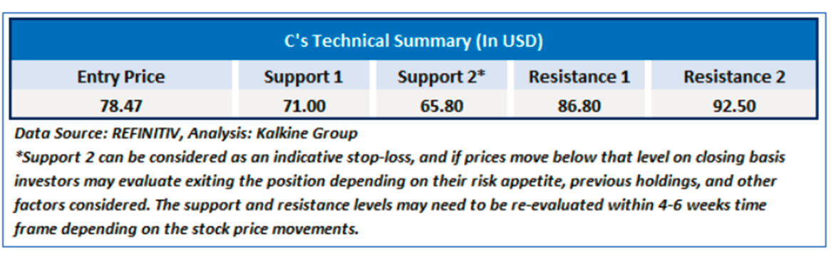 Considering company’s elevated credit costs of USD 2.7 billion during Q1 FY25, driven primarily by rising net credit losses in cards and a firmwide allowance for credit loss (ACL) build, reflecting macroeconomic uncertainty and a deteriorating outlook, a ‘Sell’ rating is assigned to the ‘C’ at the closing market price of USD 88.72 as of 03 July 2025.