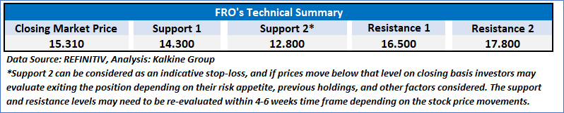 As per our previous Kalkine’s Inflation Report published on ‘FRO’ on 28th May 2025, Kalkine provided a ‘Buy’ stance on the stock at USD 15.31, based on “Frontline plc’s solid fundamentals, including robust revenue, operational efficiency with a modern, cost-efficient fleet, strong cash flow generation from strategic financial manoeuvres like the USD 512.1 million sale-and-leaseback, and an attractive current valuation”, giving a return of 20.18%, attaining resistance 1 and resistance 2.