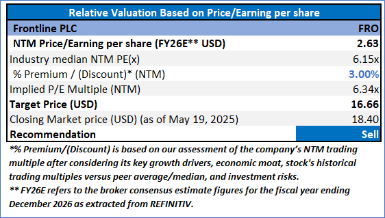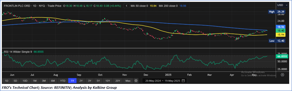 Considering the current trading levels, target price attainment, volatile macro environment, lower intrinsic value as per P/E relative valuation, tariffs uncertainties, resistance 1 and resistance 2 attainment, and risks associated, a ‘Sell’ rating is assigned to the “FRO” at the closing market price of USD 18.40, as of May 19, 2025.