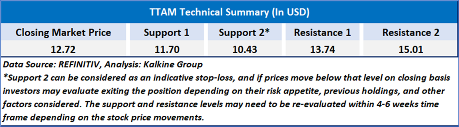 Considering a volatile market condition led by recent tariffs escalation from United States and subsequent retaliation, resistance 1 attainment, resistance around USD 14.00-USD 15.00 zone, recessionary fear, higher interest rate and geopolitical disruption a ‘Sell’ rating is assigned to the ‘TTAM’ at the closing market price of USD 14.11 as of July 11, 2025.