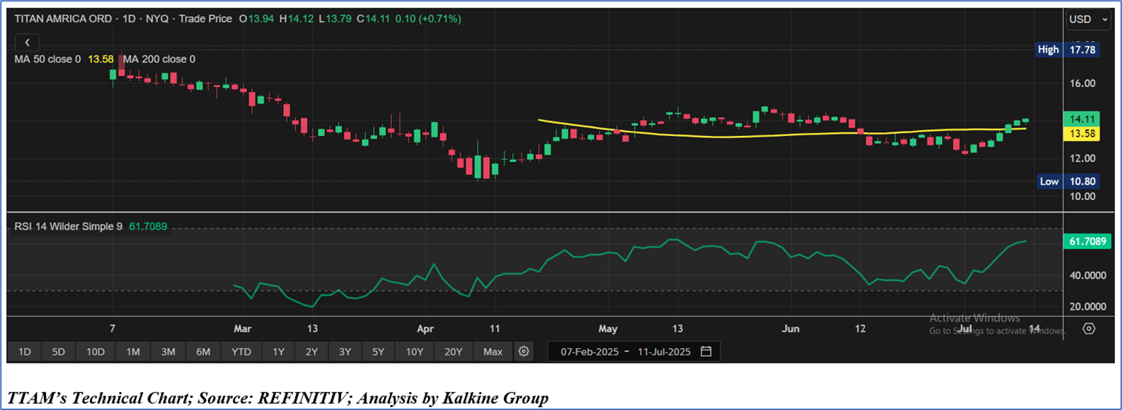 As per our previous US Daily Report published on ‘TTAM’ on July 03, 2025, Kalkine provided a ‘Buy’ stance on the stock at USD 12.72 based on “price action, recent key business and financial updates, momentum in the stock over the last month, and technical indicators analysis” and the stock price has now moved up by ~10.93% since then and has attained resistance 1.