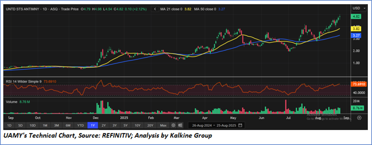 United States Antimony Corp (UAMY) is showing strong bullish momentum, trading well above its 21-day and 50-day moving averages with rising volume support. The breakout above USD 4.50 signals strength, though the RSI at 73 suggests the stock is overbought and may face short-term consolidation.