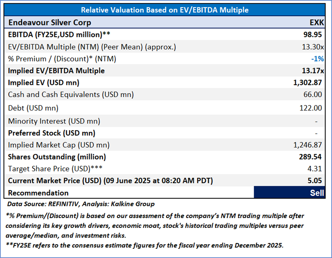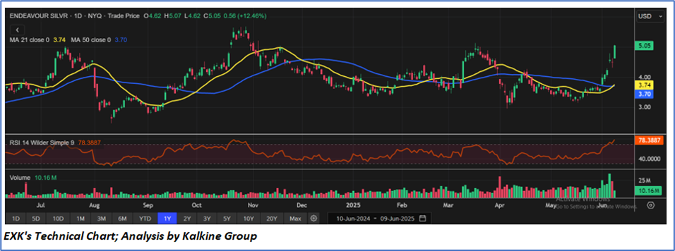 Based on the notional gains, valuation downside and price action stance, a "Sell" recommendation on Endeavour Silver Corp (NYSE: EXK) has been given at the current market price of USD 5.05 as on 09 June 2025 at 08:20 AM PDT.
