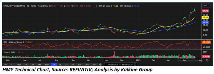 Harmony Gold Mining Co. (HMY) is in a strong uptrend, trading well above its 21-day and 50-day moving averages, with recent price action showing a sharp rally supported by high volume. The RSI is in overbought territory (73.2), indicating strong bullish momentum but also suggesting the potential for a short-term pullback or consolidation. Overall, the technical setup remains bullish, but caution is warranted due to the extended run and elevated momentum indicators.