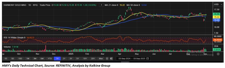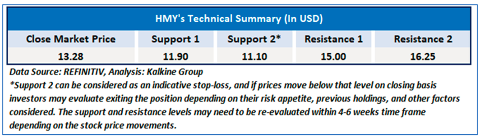 As per our previous US Dailies Report published on ‘HMY’ on Sep 02, 2025, Kalkine provided ‘Buy’ stance on the stock at USD 13.28 based on technical analysis and the stock price has now moved up by ~ 17.09% since then and has breached resistance level 1.