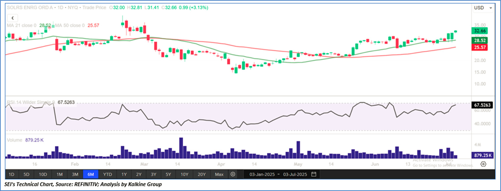 Solaris Energy Infrastructure, Inc. (NYSE: SEI) provides mobile and scalable equipment-based solutions for use in distributed power generation as well as the management of raw materials used in the completion of oil and natural gas wells. Its segments include Solaris Power Solutions and Solaris Logistics Solutions. As per our previous US Dailies report published on ‘SEI’ on 1st July 2025, Kalkine provided a ‘Buy’ stance on the stock at USD 28.29 based on technical analysis and the stock price has now moved up by ~15.45% and trading below resistance 2.