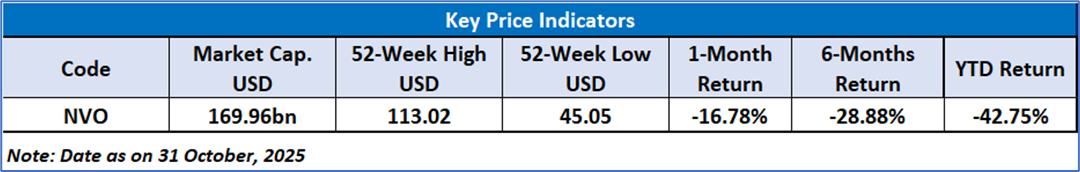 Novo Nordisk A/S (NYSE: NVO) is a global healthcare company specializing in diabetes management and treatment. It focuses on the research, development, production, and commercialization of pharmaceutical products. The company operates through two primary business segments: Diabetes and Obesity Care and Biopharmaceuticals.