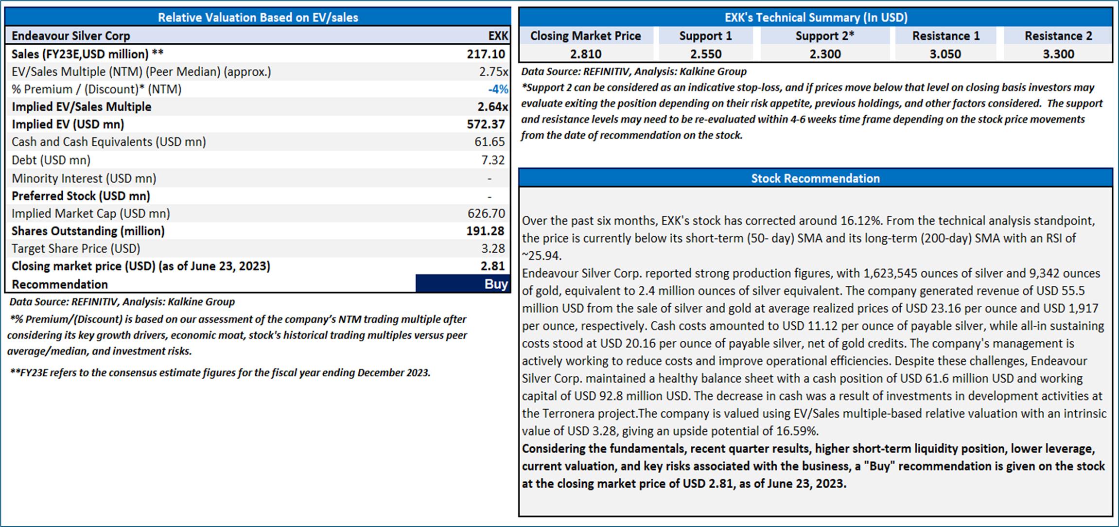Section 2: Endeavour Silver Corporation (“BUY” at the closing market price of USD 2.81 as of June 23, 2023)