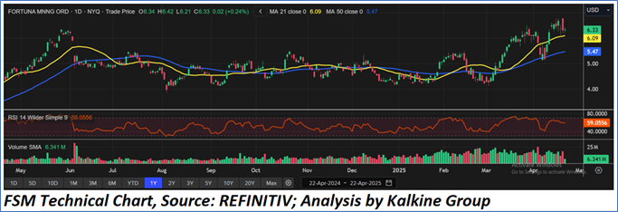 As per the above-mentioned price action, recent key business and financial updates, momentum in the stock over the last month, and technical indicators analysis, a ‘Speculative Buy’ rating has been given to Fortuna Mining Corp (NYSE: FSM) at the current market price of USD 6.33 as of April 22,2025 at 08:35AM PDT.