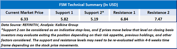 FSM is in a strong uptrend, trading well above its 21-day and 50-day moving averages, with recent price action showing a sharp rally supported by high volume. The RSI of 59.06 is in overbought territory, indicating strong bullish momentum but also suggesting the potential for a short-term pullback or consolidation. Overall, the technical setup remains bullish, but caution is warranted due to the extended run and elevated momentum indicators.