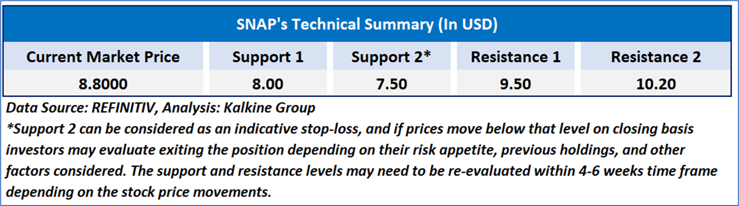 The 14-day Relative Strength Index (RSI) is currently at 57.38, near mid-levels upward trending, with the expectations of consolidation or upward momentum if the current important support fo USD 8.00 holds. In addition, the current price is between both the 50-day Simple Moving Averages (SMAs) and 200-day SMA, which may work as medium to long term support and resistance levels respectively.