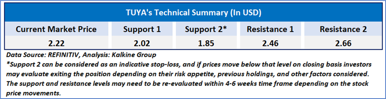 Tuya Inc (NYSE: TUYA) is a technology company focused on offering Internet of Things (IoT) cloud development platforms and related services. Through its IoT cloud platform, the company delivers a range of solutions, including Platform-as-a-Service (PaaS), Software-as-a-Service (SaaS), and smart IoT device solutions. As per our previous US Daily report published on ‘TUYA’ on Nov 10, 2025, Kalkine provided a ‘Buy’ stance on the stock at USD 2.22 based on technical analysis and the stock price has now moved up by 13.51% and trading above resistance 1.