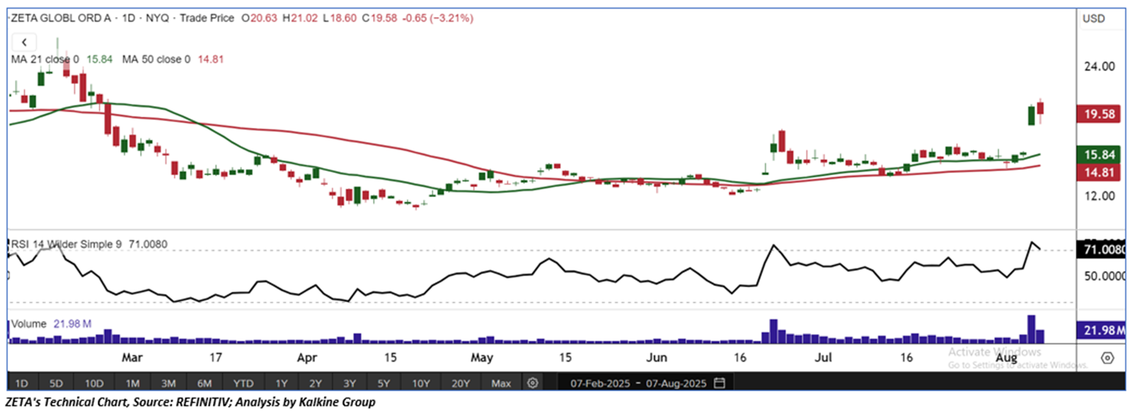 Zeta Global Holdings Corp (NYSE: ZETA) operates a data-driven cloud platform that helps enterprises enhance consumer intelligence and automate marketing. Its software enables businesses to target, connect with, and engage consumers through personalized marketing across multiple channels, including email, social media, websites, chat, connected TV (CTV), and video. As per our previous US Dailies Report published on ‘ZETA’ on 19th Mar 2025, Kalkine provided a ‘Buy’ stance on the stock at USD 13.86 based on fundamental analysis and the stock price has now moved up by ~41.27% and trading above target 2.