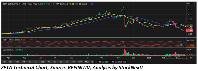 ZETA is in a clear downtrend, trading below its 21-day and 50-day moving averages, with strong selling pressure. The stock has declined from its November 2024 peak above USD 35 and is now testing key support around USD 13.00-13.50. The RSI at 33.47 indicates bearish momentum but isn't yet oversold. A break below support could lead to further downside, while a recovery above USD 15 with strong volume would signal potential reversal.