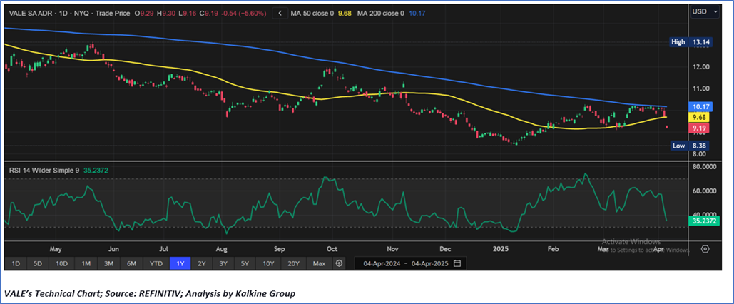 Considering the current trading levels, volatile macro environment, tariffs increased both by US and China, breaking of key important support of USD 9.50-USD 10.00, and risks associated, a ‘Sell’ rating is assigned to the “VALE” at the current market price of USD 9.19, as of April 04, 2025, at 07:30 am PDT.