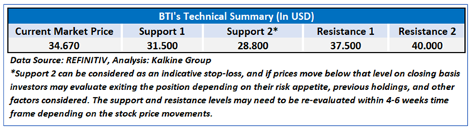 As per our previous US Dividend Income Report published on ‘BTI’ on Oct 23, 2025, Kalkine provided an ‘Buy’ stance on the stock at USD 34.67 based on fundamental analysis and the stock price has now moved by ~18.75% since then and has breached resistance 2.