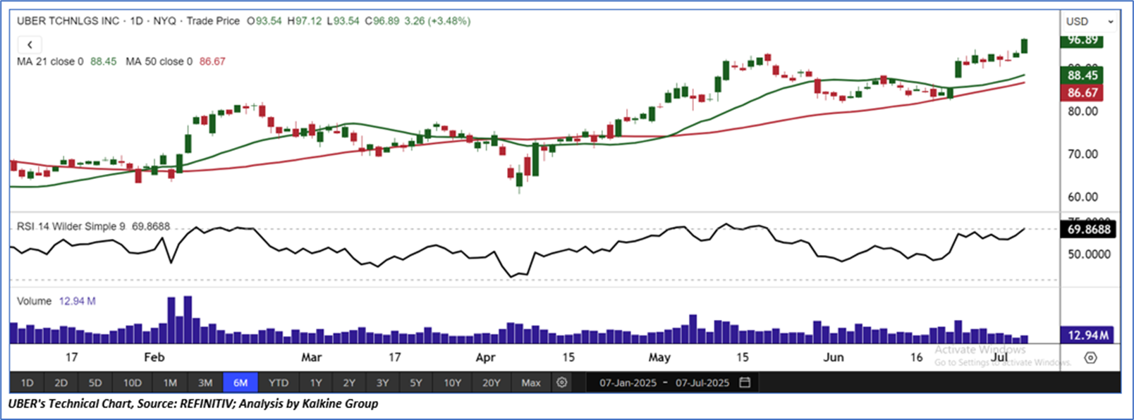 Uber Technologies, Inc. (NYSE: UBER) is a technology platform, which engages in the development and operation of technology applications, networks, and product to power movement from point A to point B. As per our previous US Dailies report published on ‘UBER’ on 16th June 2025, Kalkine provided a ‘Buy’ stance on the stock at USD 85.50 based on technical analysis and the stock price has now moved up by ~13.32% and trading below resistance 2.