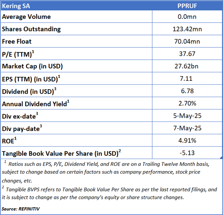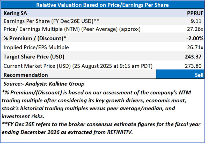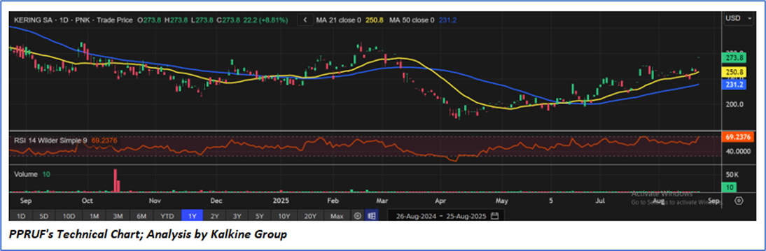 Based on the notional gains, valuation downside and price action stance, a "Sell" recommendation on Kering SA (OTC: PPRUF) has been given at the current market price of USD 273.80 as on 25 August 2025 at 9:15 am PDT.