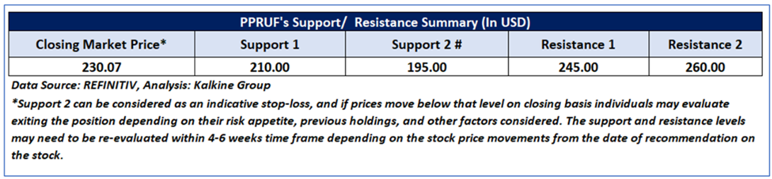 As per our previous Kalkine’s Global Tariff Report published on ‘PPRUF’ on July 08, 2025, Kalkine provided an ‘Buy’ stance on the stock at USD 230.07 based on fundamental analysis and the stock price has now moved up by ~ 19.01% since then and has breached resistance level 2.