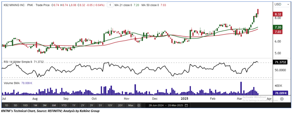 K92 Mining, Inc. (OTC: KNTNF) engages in the exploration, development, and mining of mineral deposits. The company was founded by Bryan Slusarchuk Jr. on March 22, 2010 and is headquartered in Vancouver, Canada. As per our previous US Dailies report published on ‘KNTNF’ on 12th Feb 2025, Kalkine provided an ‘Speculative Buy’ stance on the stock at USD 7.30 based on technical analysis and the stock price has now moved by ~ 13.97% since then and is trading above resistance 1.