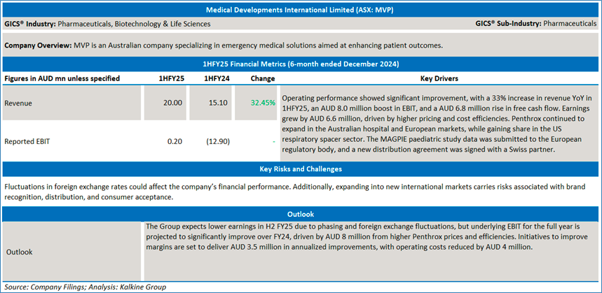 Company Overview: Medical Developments International Limited (ASX: MVP) is an Australian company specializing in emergency medical solutions aimed at enhancing patient outcomes. MVP offers emergency pain relief and respiratory products, including Penthrox®, a fast-acting, non-opioid treatment for pain relief in trauma and emergency situations. Kalkine’s Daily Report covers the Key Financial Metrics, Risks, Outlook, Technical Analysis along with the Valuation, Target Price, and Recommendation on the stock.