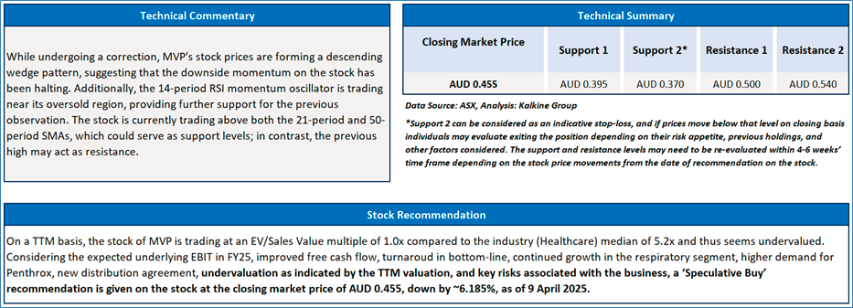 The stock has decreased by ~21.8% in the last one month, and over the past one year, stock has moved down by ~23.6%. The stock has a 52-week low and 52-week high of AUD 0.365 and AUD 0.940, respectively, and is currently trading below the 52-week high-low average. MVP was last covered in a report dated ’21 March 2025’.