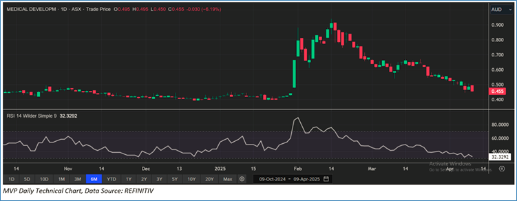 Section 2.0: Medical Developments International Limited (‘Speculative Buy’ at AUD 0.455, closing market price per share as on 9 April 2025)