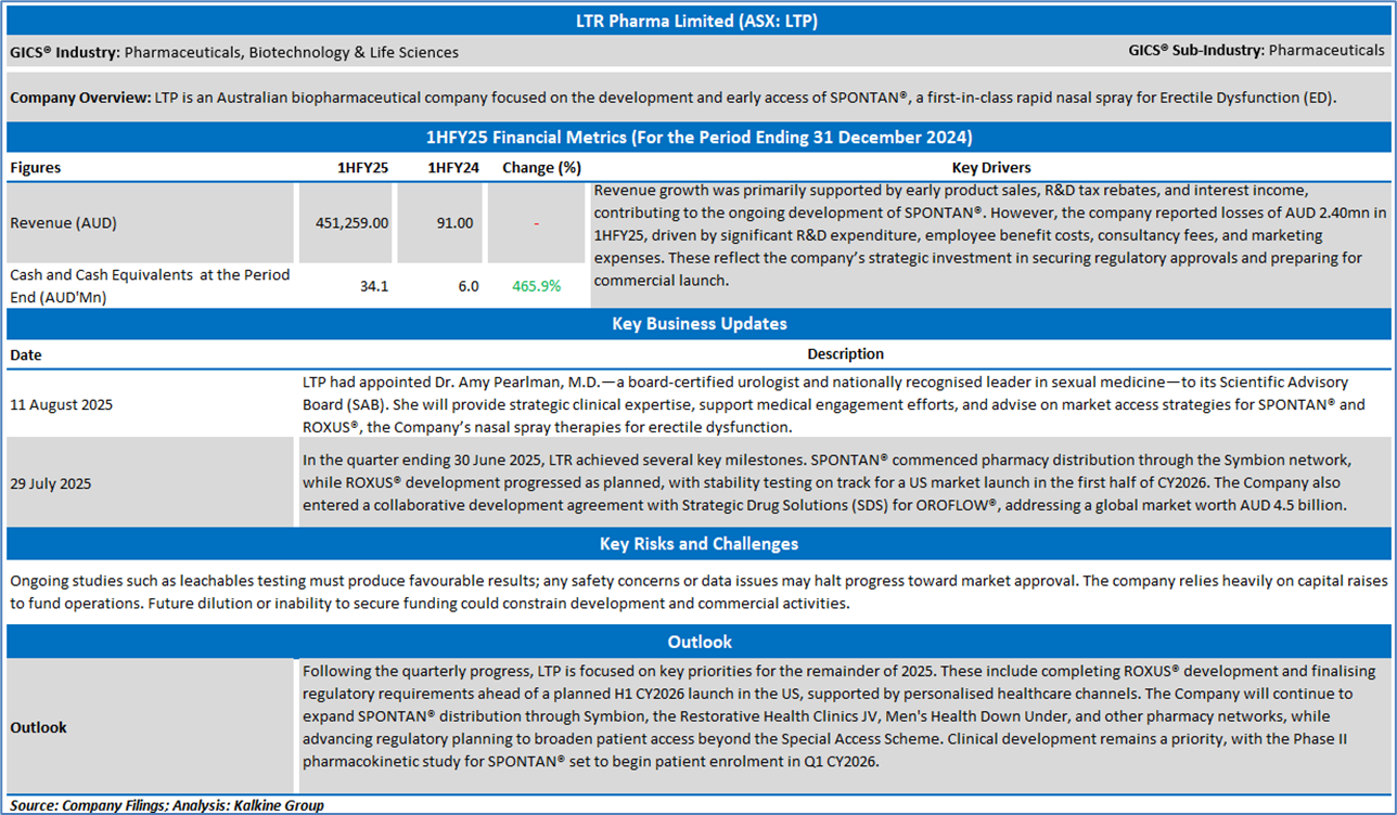 Company Overview: LTR Pharma Limited (ASX: LTP) is an Australian biopharmaceutical company focused on the development and early access of SPONTAN®, a first-in-class rapid nasal spray for Erectile Dysfunction (ED). The company has achieved positive clinical outcomes, entered early access pathways, and formed strategic global partnerships, including with Aptar Pharma. Kalkine’s Daily Report covers the Key Financial Metrics, Risks, Outlook, and Technical Analysis along with TTM-based Valuation, Target Price, and Recommendation on the stock.