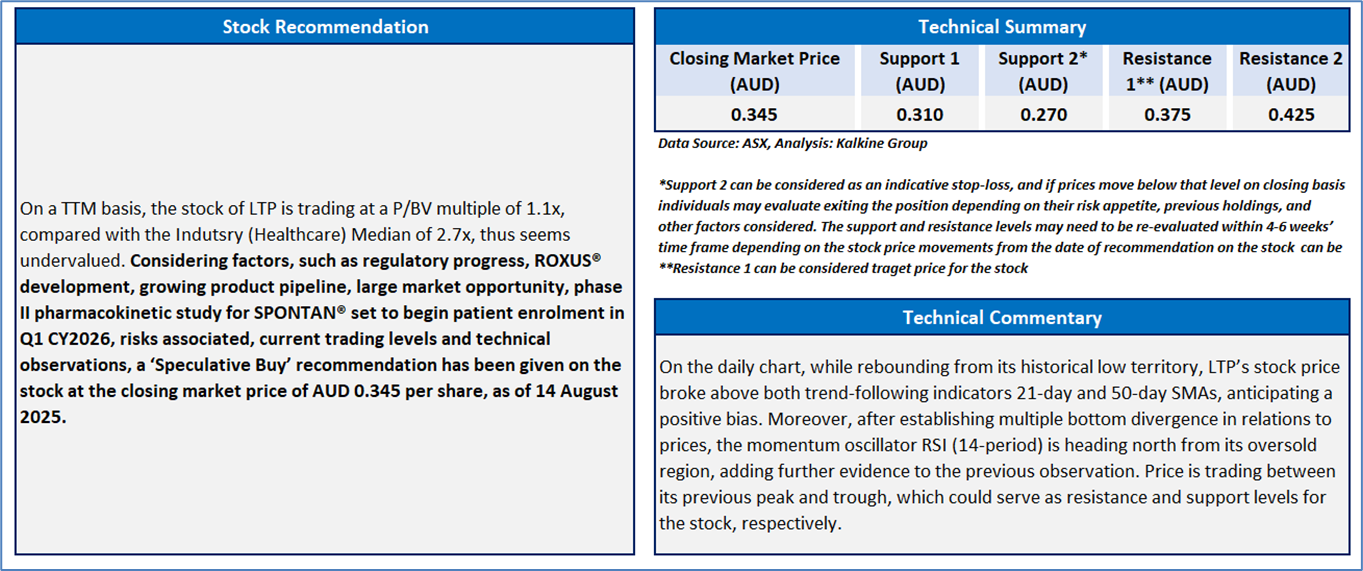 Section 2.0: LTR Pharma Limited (‘Speculative Buy’ at AUD 0.345, closing market price per share as on 14 August 2025)