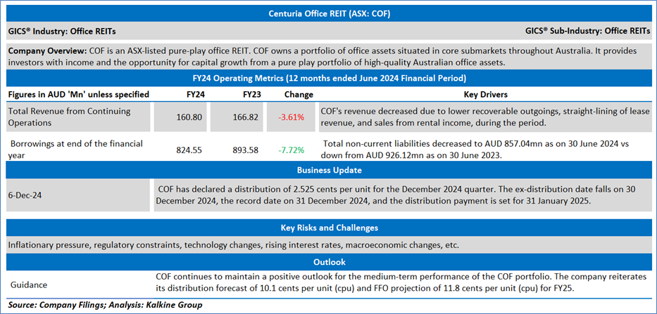 Company Overview: Centuria Office REIT (ASX: COF) is an ASX-listed pure play office REIT. COF owns a portfolio of office assets situated in core submarkets throughout Australia. It provides investors with income and the opportunity for capital growth from a pure play portfolio of high-quality Australian office assets. Kalkine’s Daily Report covers the Key Financial Metrics, Risks, Outlook, and Technical Analysis along with the Valuation, Target Price, and Recommendation on the stock.