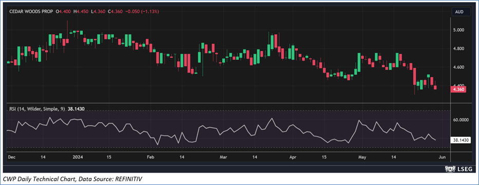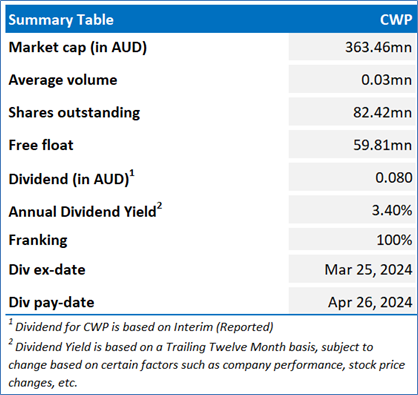 The stock has witnessed a dip of ~6.4% in last six months, and over the last one year, it has decreased by ~9.3%. The stock has a 52-week low and 52-week high of AUD 4.200 and AUD 5.660, respectively and is currently trading below the 52-week high-low average. CWP was last covered in a report dated ’7 May 2024’.