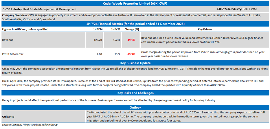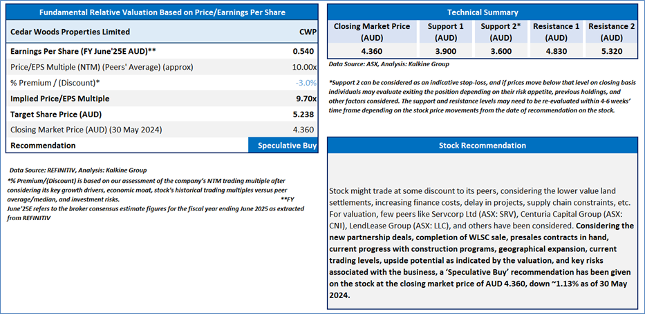 Section 2.0: Cedar Woods Properties Limited (‘Speculative Buy’ at AUD 4.36 closing market price per share as on 30 May 2024)