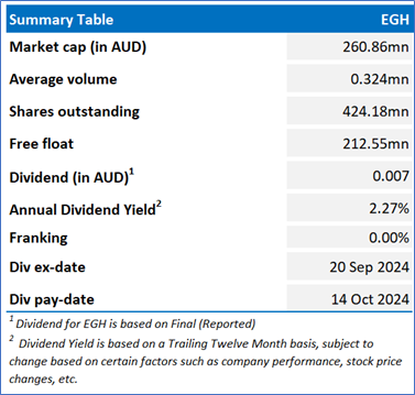 Eureka Group Holdings Limited (ASX: EGH) provides independent rental accommodation to independent retirees who are supported by the Australian Government pension. The company was listed on ASX on 01 July 2004.
