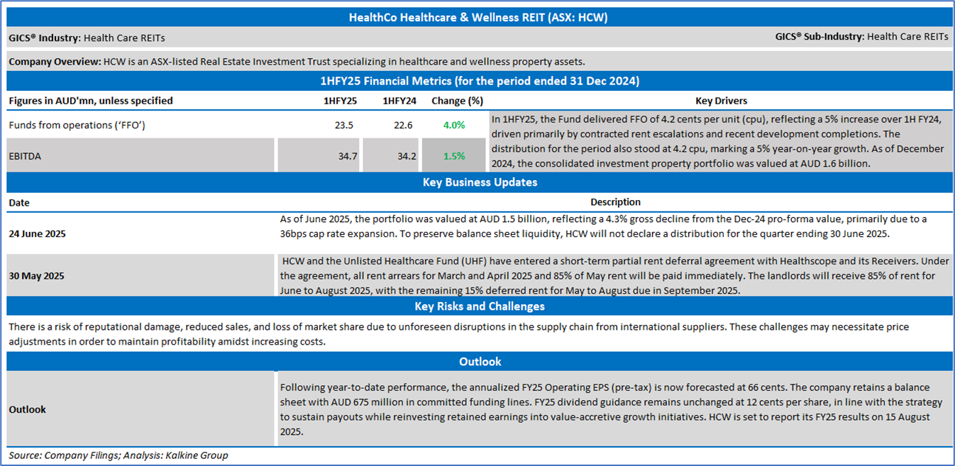 Company Overview: HealthCo Healthcare & Wellness REIT (ASX: HCW) is an ASX-listed Real Estate Investment Trust specializing in healthcare and wellness property assets. Its aim is to offer investors exposure to a diversified portfolio driven by major healthcare sector trends, focusing on delivering stable and growing distributions, long-term capital appreciation, and positive environmental and social outcomes. Kalkine’s Daily Report covers the Key Financial Metrics, Risks, Outlook, Technical Analysis along with the Valuation, Target Price, and Recommendation on the stock.