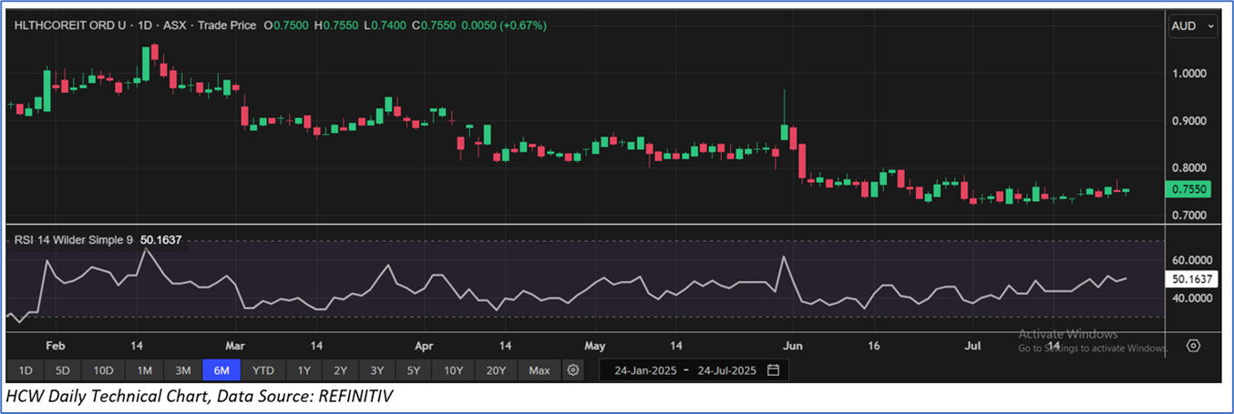 The stock has witnessed a dip of ~9.6% in the last three months, and over the last nine months, it has decreased by ~35.3%. The stock has a 52-week low and 52-week high of AUD 0.720 and AUD 1.263, respectively, and is currently trading below the 52-week high-low average. HCW was last covered in a report dated ’10 June 2025’.