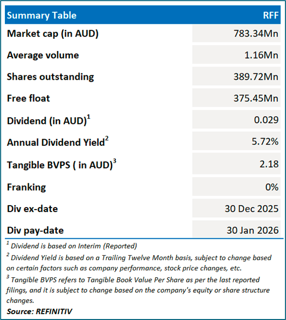 Rural Funds Group is an Australia-based real estate investment trust (REIT). The company owns a diversified portfolio of agricultural assets that are leased predominantly to corporate agricultural operators. It is primarily engaged in the development and leasing of agricultural properties and equipment.
