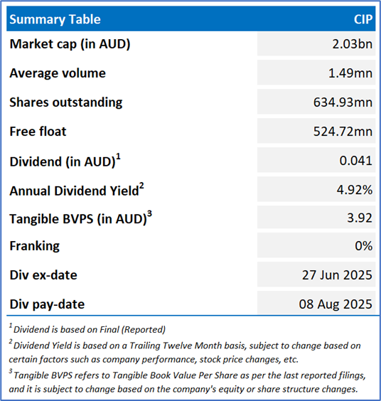 CIP is an Australia-based real estate investment trust (REIT) that has been listed on the ASX since December 2012. The company focuses on building a portfolio of industrial assets located in urban infill areas throughout Australia, supported by a diverse tenant base.