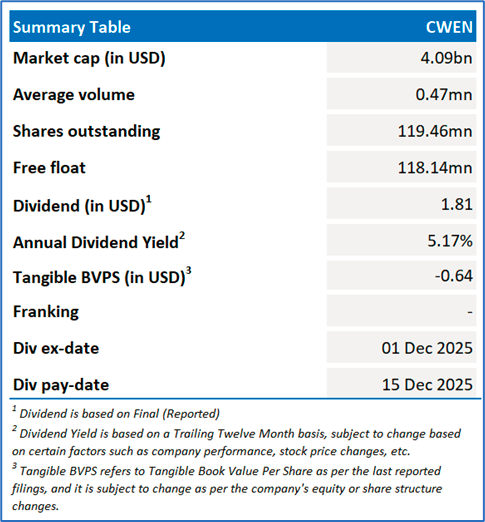 Company Overview: CWEN is a renewable energy company. It invests in energy infrastructures and focuses on investments in clean energy and owns modern, sustainable and long-term contracted assets across North America. Its businesses are segregated based on conventional power generation and renewable businesses, which consist of solar, wind and energy storage.