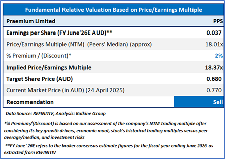 Considering the revenue from the OneVue platform, increase in average Platform FUA, continued growth in Scope+ non-custodial Portfolio Administration and Reporting Service, etc., the company might trade at a slight premium to its peers. For valuation, few peers like Integrated Research Ltd (ASX: IRI), Readytech Holdings Ltd (ASX: RDY), Cosol Ltd (ASX: COS), and others have been considered. Considering that the stock has surpassed its R1 level, macroeconomic uncertainty, current trading level, and risks associated, the share price can face consolidation at the current levels. Hence, a ‘Sell’ recommendation is given on the stock at the current price of AUD 0.77 (as of 24 April 2025, at 10:30 AM AEST).