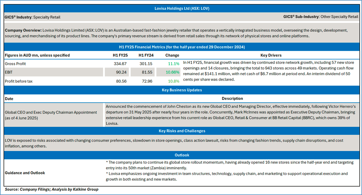 Company Overview: Lovisa Holdings Limited (ASX: LOV) is an Australian-based fast-fashion jewelry retailer that operates a vertically integrated business model, overseeing the design, development, sourcing, and merchandising of its product lines. The company's primary revenue stream is derived from retail sales through its network of physical stores and online platforms. Kalkine’s Daily Report covers the Key Financial Metrics, Risks, Outlook, Technical Analysis along with the Valuation, Target Price, and Recommendation on the stock.