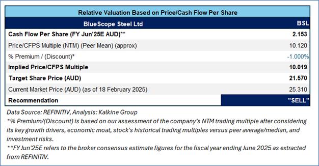 BSL is expected to trade at a slight discount compared to its peers considering the 8.1% YoY decline in underlying EBIT return on invested capital in H1 FY25, and AU$260 million YoY decrease in reported NPAT in H1 FY25. For conducting valuation, the following peers have been considered: Brambles Ltd (ASX: BXB), Amcor PLC (ASX: AMC), and GWA Group Ltd (ASX: GWA).