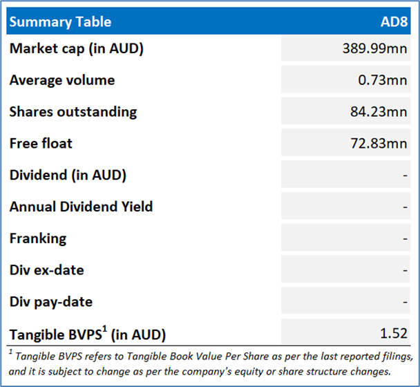 The stock has witnessed a dip of ~24.3% in the last one month, and over the last six months, it has decreased by ~42.5%. The stock has a 52-week low and 52-week high of AUD 4.470 and AUD 10.990, respectively and is currently trading below the 52-week high-low average. AD8 was last covered in a report dated ’15 August 2025’.