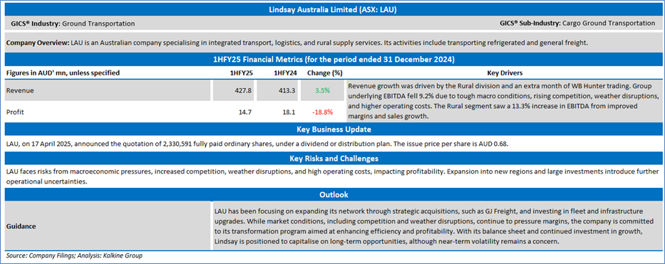 Company Overview: Lindsay Australia Limited (ASX: LAU) is an Australian company specialising in integrated transport, logistics, and rural supply services. Its activities include transporting refrigerated and general freight. Kalkine’s Daily Report covers the Key Financial Metrics, Risks, Outlook, and Technical Analysis along with the Valuation, Target Price, and Recommendation on the stock.